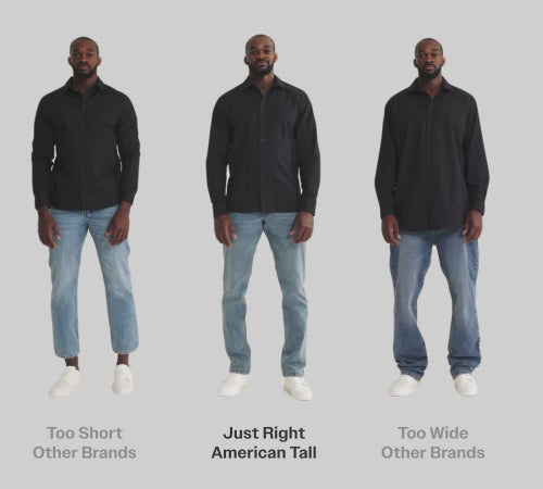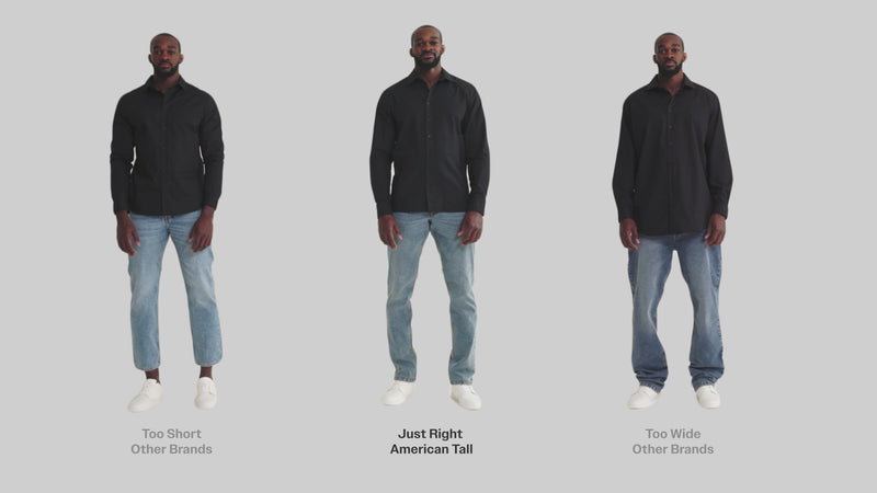 The American Tall fit is so much more than just adding length to the garment. We engineer the garment proportionally. That means it’s thoughtfully tailored through the body or intentionally tapered at the waist, so you’re not swimming in fabric. Gone are the days of sizing up to get the length you need.